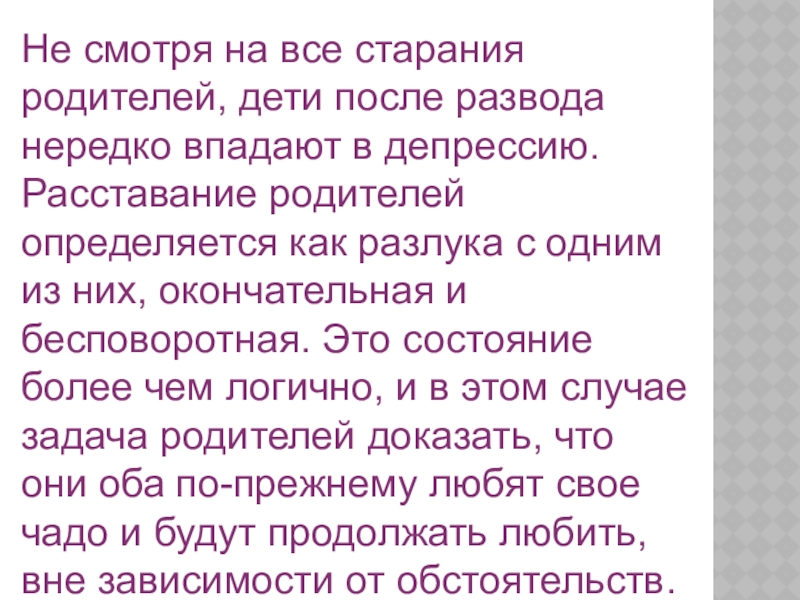 Слайд 8Не смотря на все старания родителей, дети после развода нередко впадают