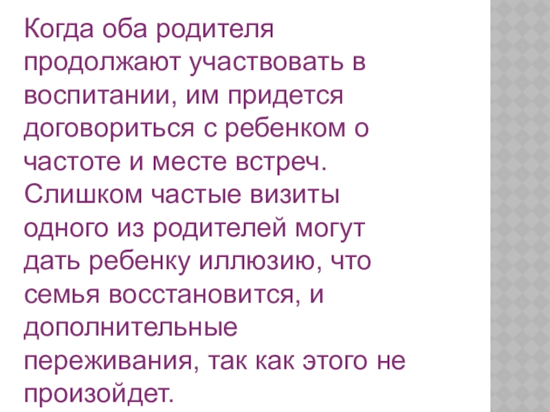 ребенком о частоте и месте встреч. Слишком частые визиты одного из родителей могут дать ребенку иллюзию, что семья восстановится, и дополнительные переживания, так как этого не произойдет.