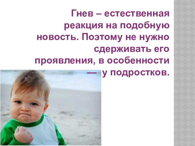 Слайд 18Гнев – естественная реакция на подобную новость. Поэтому не нужно сдерживать