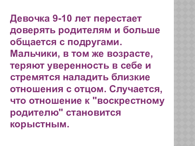 Слайд 14Девочка 9-10 лет перестает доверять родителям и больше общается с подругами.