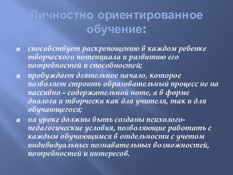и обучения. Он означает действенное внимание к каждому ученику, его творческой индивидуальности в условиях классно- урочной системы обучение по обязательным учебным программам, предполагает сочетание фронтальных, групповых и индивидуальных заданий для повышение качества и развития каждого ученика.
