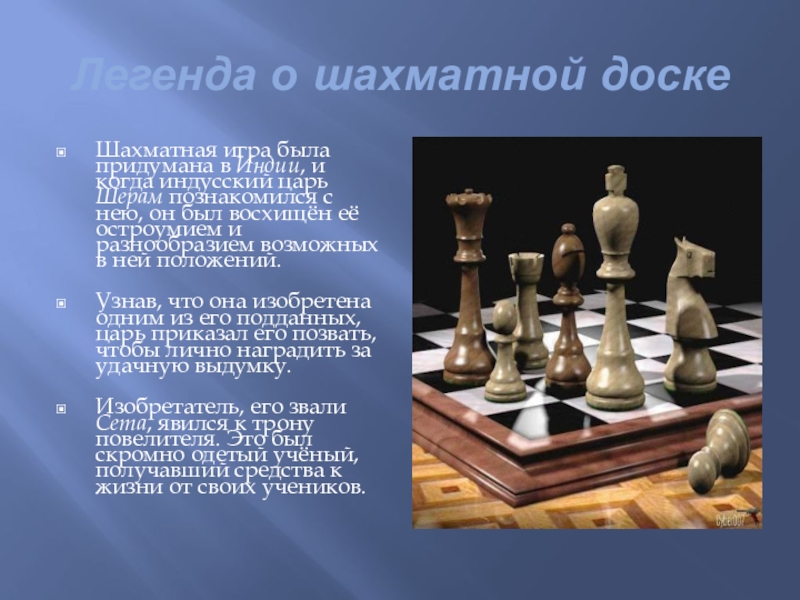 Изобретатель, его звали Сета, явился к трону повелителя. Это был скромно одетый учёный, получавший средства к жизни от своих учеников.