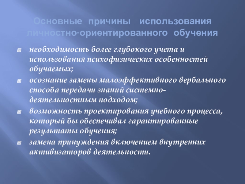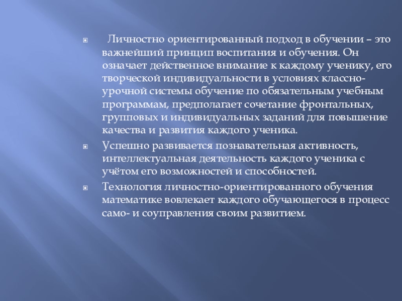 Технология личностно-ориентированного обучения математике вовлекает каждого обучающегося в процесс само- и соуправления своим развитием.