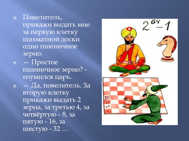 Слайд 8Повелитель, прикажи выдать мне за первую клетку шахматной доски одно