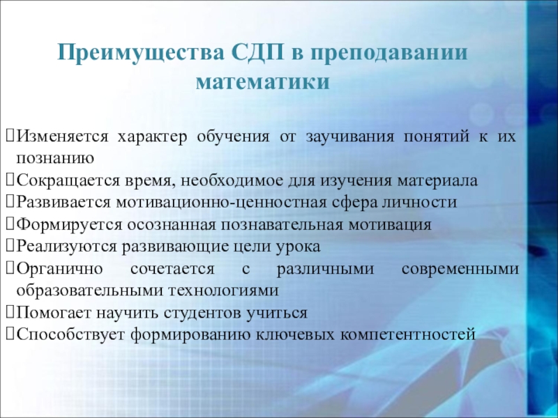 Слайд 26Преимущества СДП в преподавании математики