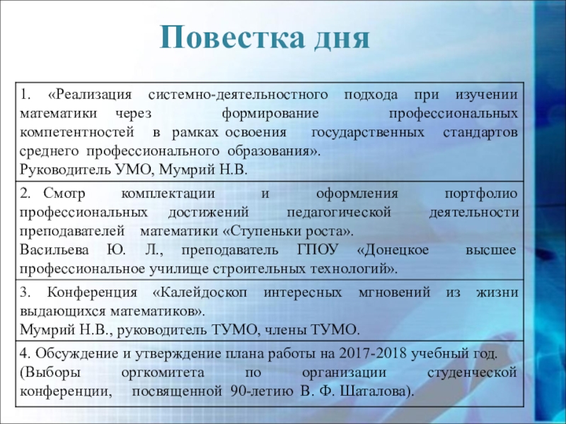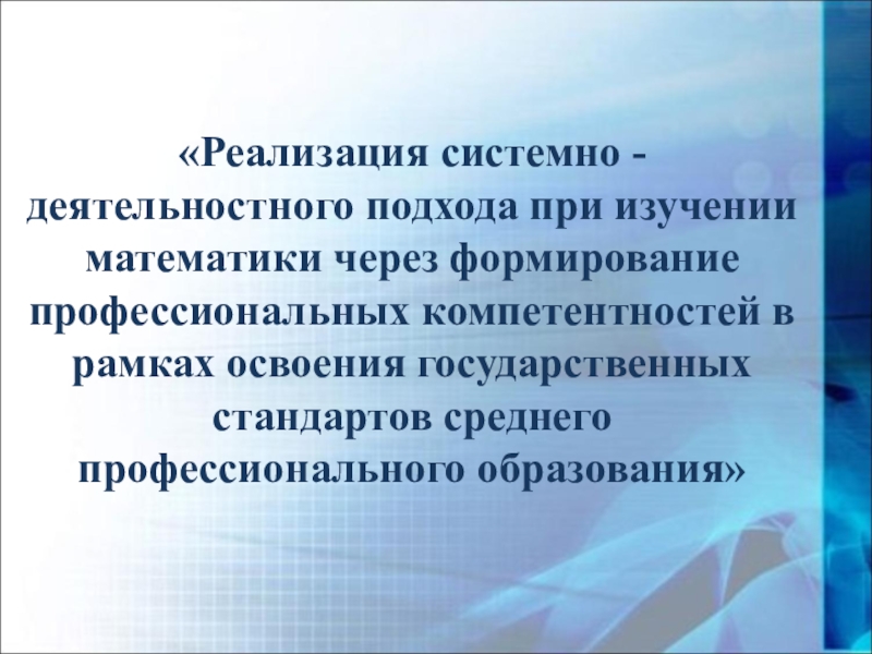 Слайд 3«Реализация системно - деятельностного подхода при изучении математики через формирование профессиональных