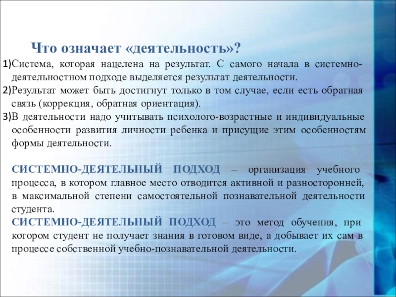 СИСТЕМНО-ДЕЯТЕЛЬНЫЙ ПОДХОД – это метод обучения, при котором студент не получает знания в готовом виде, а добывает их сам в процессе собственной учебно-познавательной деятельности.