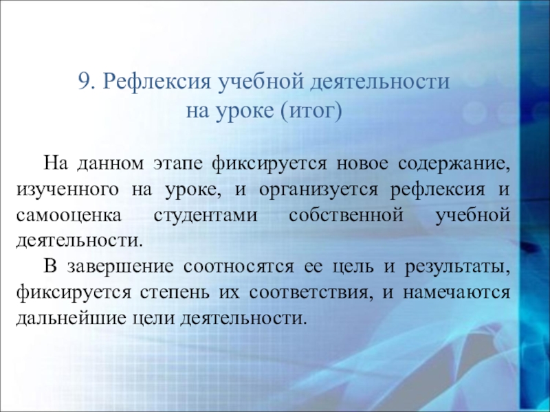 В завершение соотносятся ее цель и результаты, фиксируется степень их соответствия, и намечаются дальнейшие цели деятельности.