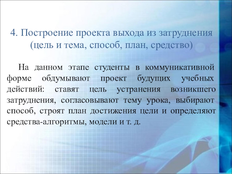 На данном этапе студенты в коммуникативной форме обдумывают проект будущих учебных действий: ставят цель устранения возникшего затруднения, согласовывают тему урока, выбирают способ, строят план достижения цели и определяют средства-алгоритмы, модели и т. д.
