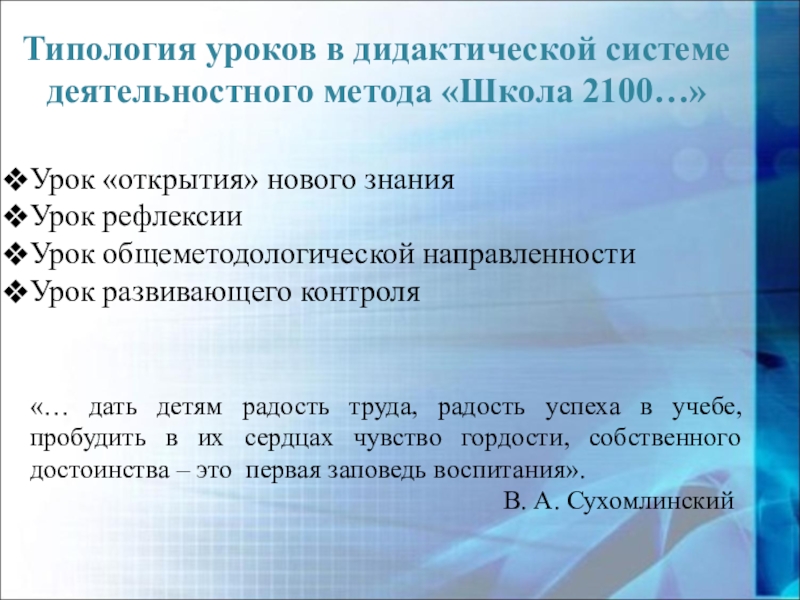 Слайд 12Типология уроков в дидактической системе деятельностного метода «Школа 2100…»