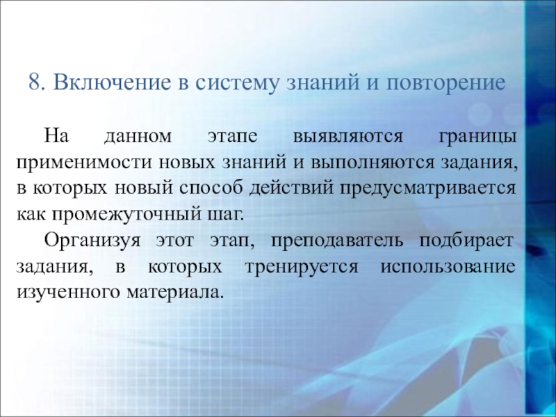 Организуя этот этап, преподаватель подбирает задания, в которых тренируется использование изученного материала.