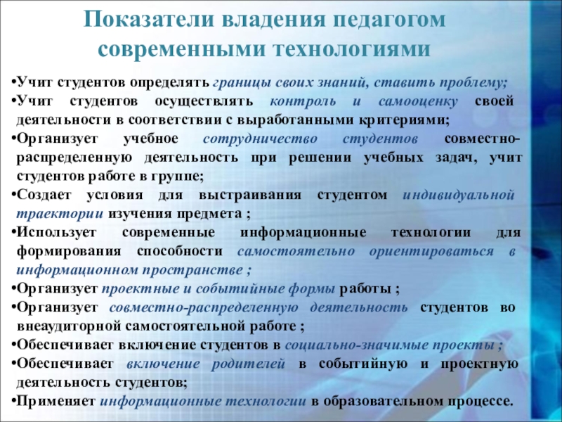 Слайд 25Показатели владения педагогом современными технологиями