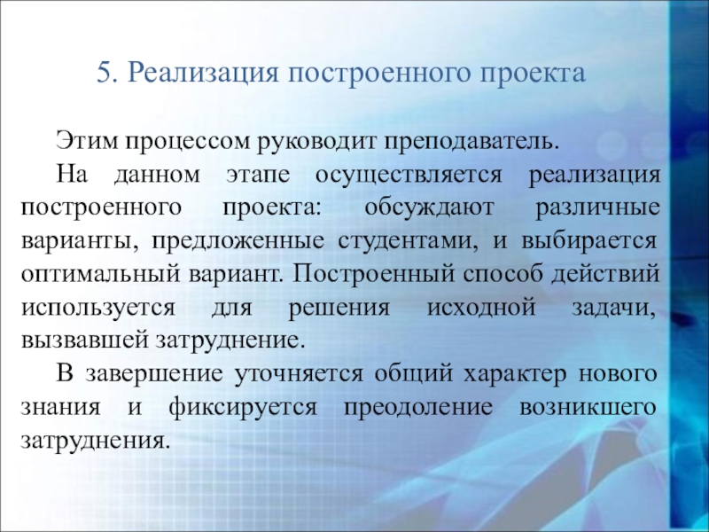 построенного проекта: обсуждают различные варианты, предложенные студентами, и выбирается оптимальный вариант. Построенный способ действий используется для решения исходной задачи, вызвавшей затруднение.