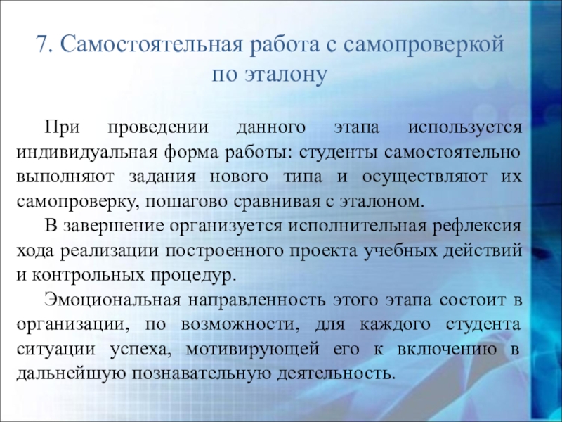 индивидуальная форма работы: студенты самостоятельно выполняют задания нового типа и осуществляют их самопроверку, пошагово сравнивая с эталоном.