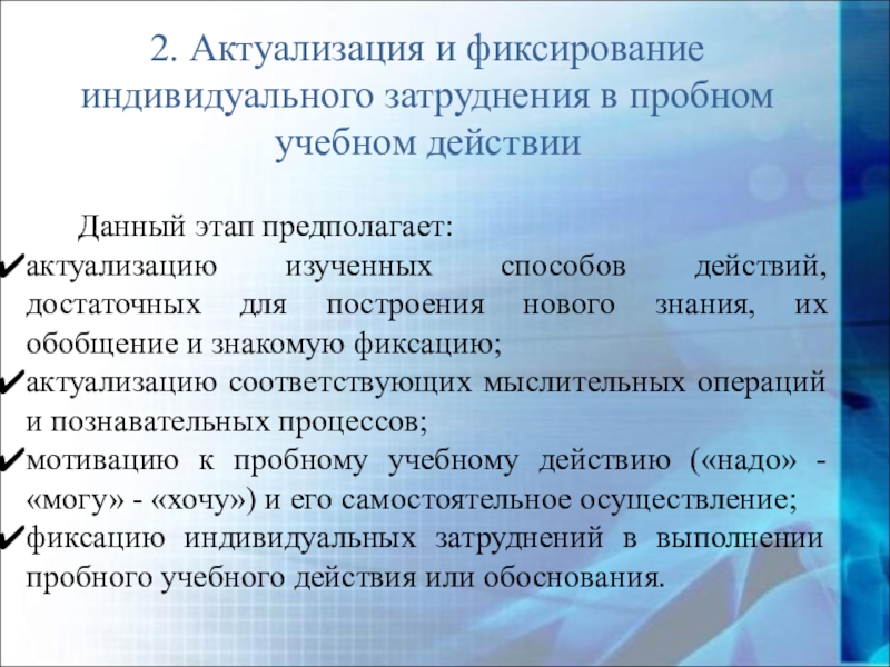 Слайд 172. Актуализация и фиксирование индивидуального затруднения в пробном учебном действии