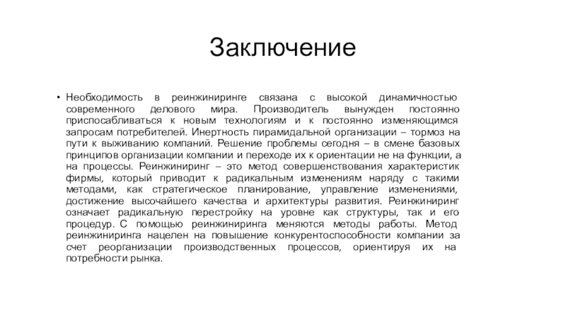вынужден постоянно приспосабливаться к новым технологиям и к постоянно изменяющимся запросам потребителей. Инертность пирамидальной организации – тормоз на пути к выживанию компаний. Решение проблемы сегодня – в смене базовых принципов организации компании и переходе их к ориентации не на функции, а на процессы. Реинжиниринг – это метод совершенствования характеристик фирмы, который приводит к радикальным изменениям наряду с такими методами, как стратегическое планирование, управление изменениями, достижение высочайшего качества и архитектуры развития. Реинжиниринг означает радикальную перестройку на уровне как структуры, так и его процедур. С помощью реинжиниринга меняются методы работы. Метод реинжиниринга нацелен на повышение конкурентоспособности компании за счет реорганизации производственных процессов, ориентируя их на потребности рынка.