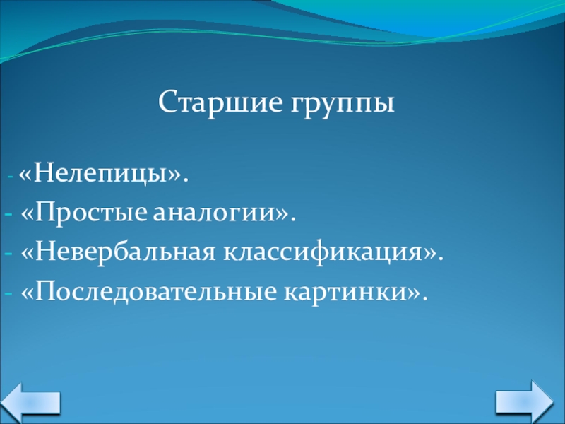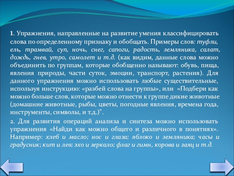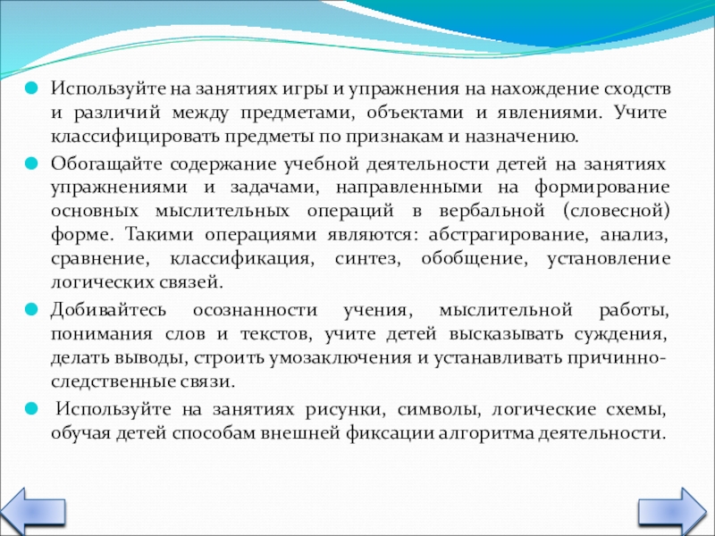 5. Использование самых различных логических задач. Развивая словесно-логическое мышление через решение логических задач, необходимо подбирать такие задачи, которые бы требовали индуктивного (от единичного к общему), дедуктивного (от общего к единичному) и традуктивного (от единичного к единичному или от общего к общему, когда посылки и заключение являются суждениями одинаковой общности) умозаключения. Например: а) Маша и Нина рассматривали картинки. Одна девочка рассматривала картинки в журнале, а другая девочка - в книжке. Где рассматривала картинки Нина, если Маша не рассматривала картинки в журнале? б) Миша сильнее, чем Олег. Миша слабее, чем Вова. Кто сильнее всех? в) Два мальчика сажали морковь и два - картошку. Что сажал Сережа, если Володя сажал картофель, Валера с Сашей и Саша с Володей сажали разные овощи, а Валера с Сережей тоже сажали разные овощи?