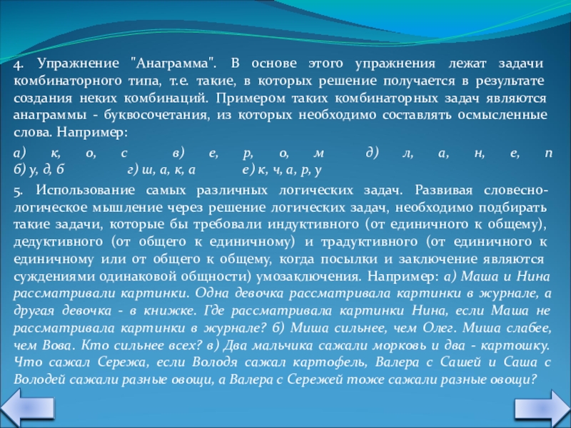 т.е. такие, в которых решение получается в результате создания неких комбинаций. Примером таких комбинаторных задач являются анаграммы - буквосочетания, из которых необходимо составлять осмысленные слова. Например: