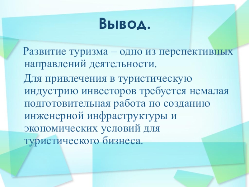 Для привлечения в туристическую индустрию инвесторов требуется немалая подготовительная работа по созданию инженерной инфраструктуры и экономических условий для туристического бизнеса.