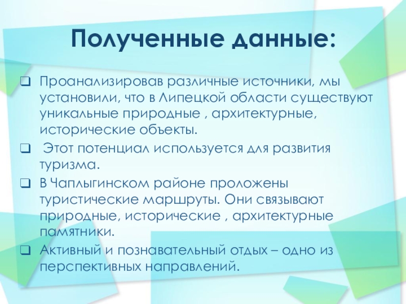 В Чаплыгинском районе проложены туристические маршруты. Они связывают природные, исторические , архитектурные памятники.