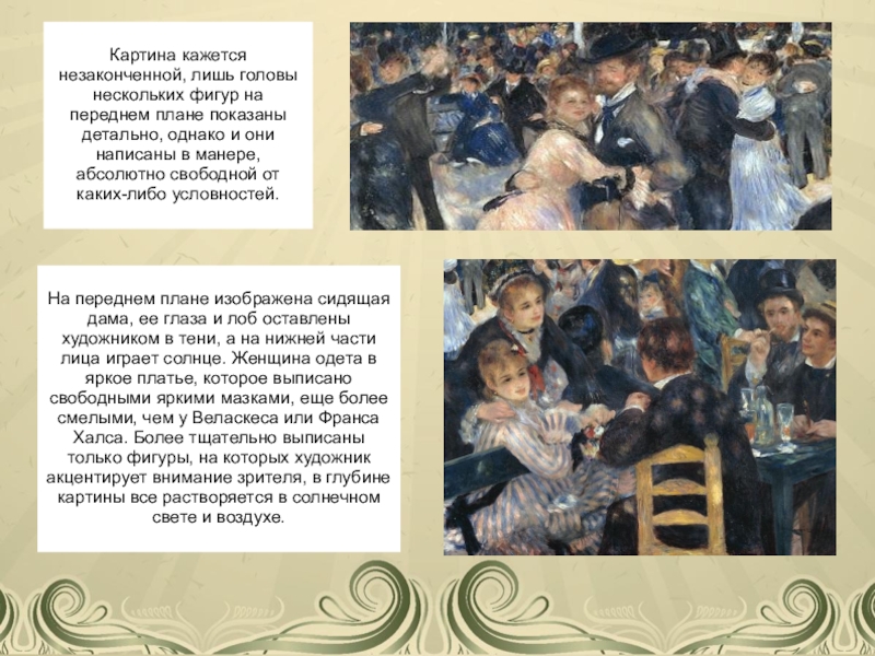 На переднем плане изображена сидящая дама, ее глаза и лоб оставлены художником в тени, а на нижней части лица играет солнце. Женщина одета в яркое платье, которое выписано свободными яркими мазками, еще более смелыми, чем у Веласкеса или Франса Халса. Более тщательно выписаны только фигуры, на которых художник акцентирует внимание зрителя, в глубине картины все растворяется в солнечном свете и воздухе.