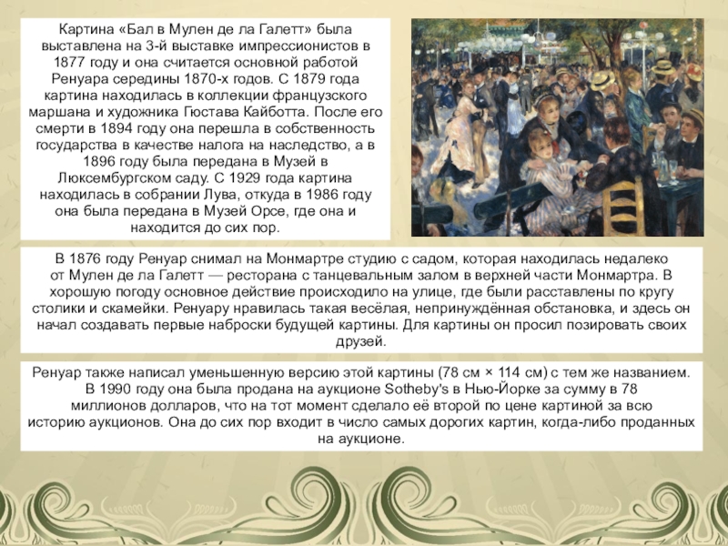 Ренуар также написал уменьшенную версию этой картины (78 см × 114 см) с тем же названием. В 1990 году она была продана на аукционе Sotheby's в Нью-Йорке за сумму в 78 миллионов долларов, что на тот момент сделало её второй по цене картиной за всю историю аукционов. Она до сих пор входит в число самых дорогих картин, когда-либо проданных на аукционе.
