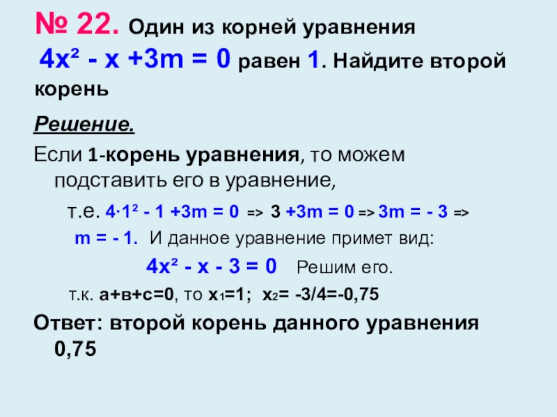 т.к. а+в+с=0, то х1=1; х2= -3/4=-0,75