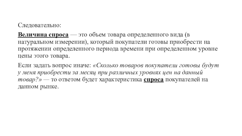 Следовательно:Величина спроса — это объем товара определенного вида (в натуральном измерении), который покупатели готовы приобрести на протяжении определенного