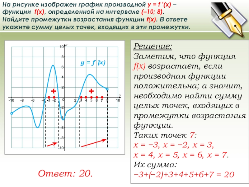 Заметим, что функция f(x) возрастает, если производная функции положительна; а значит, необходимо найти сумму целых точек, входящих в промежутки возрастания функции.