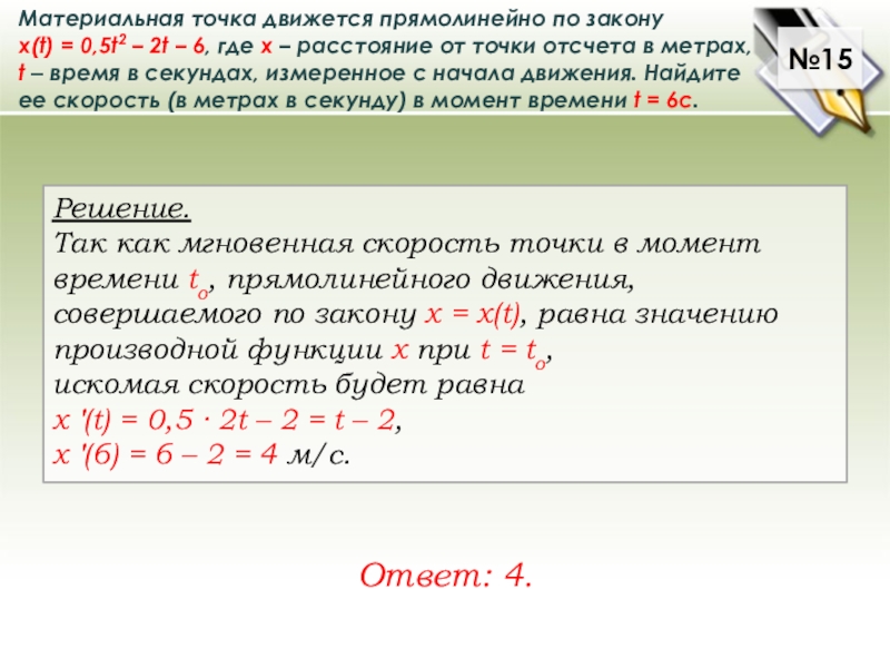 Так как мгновенная скорость точки в момент времени to, прямолинейного движения, совершаемого по закону х = х(t), равна значению производной функции х npu t = to,