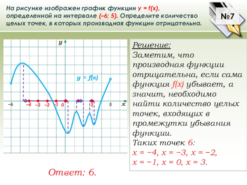 Заметим, что производная функции отрицательна, если сама функция f(x) убывает, а значит, необходимо найти количество целых точек, входящих в промежутки убывания функции.