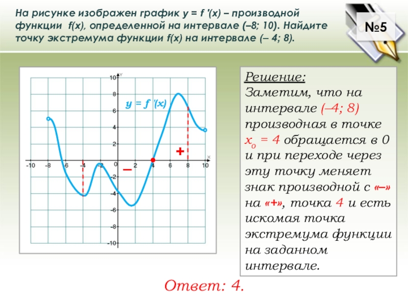 На рисунке изображен график у = f ′(x) – производной функции f(x), определенной на интервале (–8; 10). Найдите точку экстремума функции f(x) на интервале (– 4; 8).