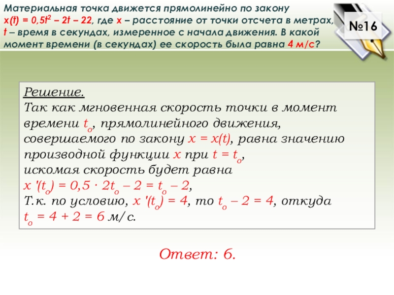 Т.к. по условию, x ′(to) = 4, то to – 2 = 4, откуда
