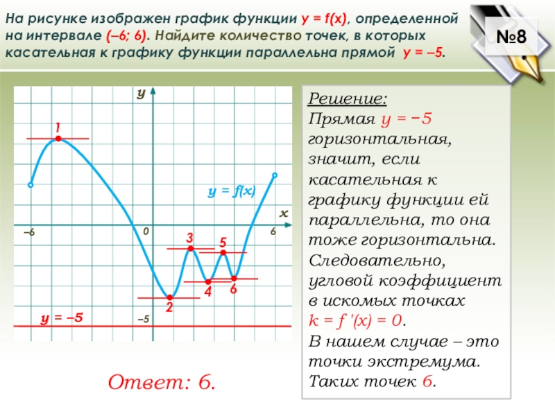 Прямая у = −5 горизонтальная, значит, если касательная к графику функции ей параллельна, то она тоже горизонтальна. Следовательно, угловой коэффициент в искомых точках