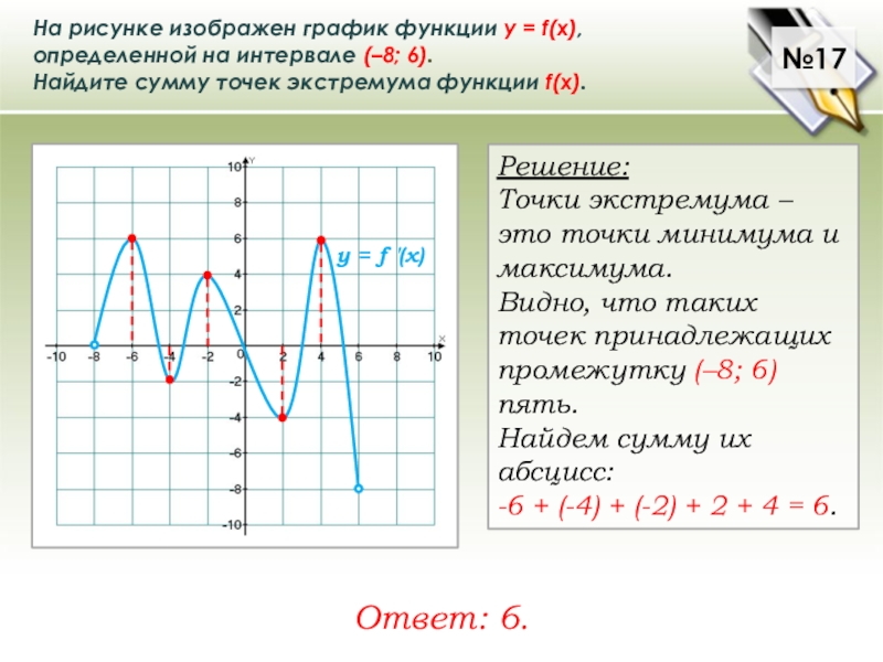 Видно, что таких точек принадлежащих отрезку [–6; 6] три. При этом в каждой точке производная меняет знак либо с «+» на «–», либо с «–» на «+».