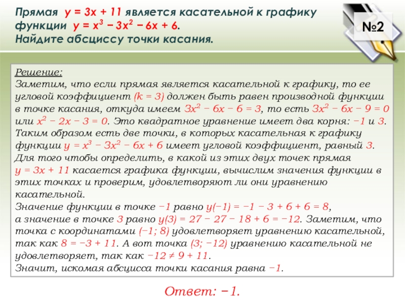 у = 3х + 11 касается графика функции, вычислим значения функции в этих точках и проверим, удовлетворяют ли они уравнению касательной.