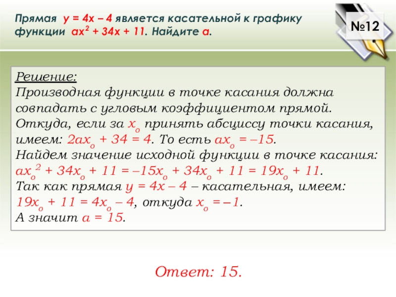 Производная функции в точке касания должна совпадать с угловым коэффициентом прямой. Откуда, если за хo принять абсциссу точки касания, имеем: 2ахo + 34 = 4. То есть ахo = –15.