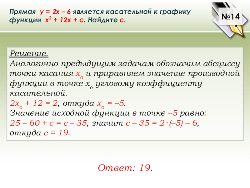 Аналогично предыдущим задачам обозначим абсциссу точки касания хо и приравняем значение производной функции в точке хо угловому коэффициенту касательной.