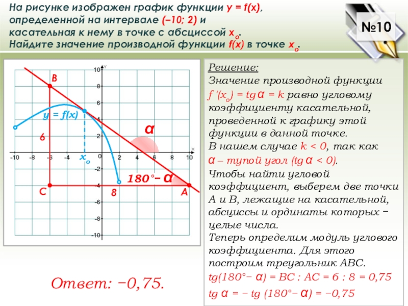 tg(180°− α) = ВС : АС = 6 : 8 = 0,75