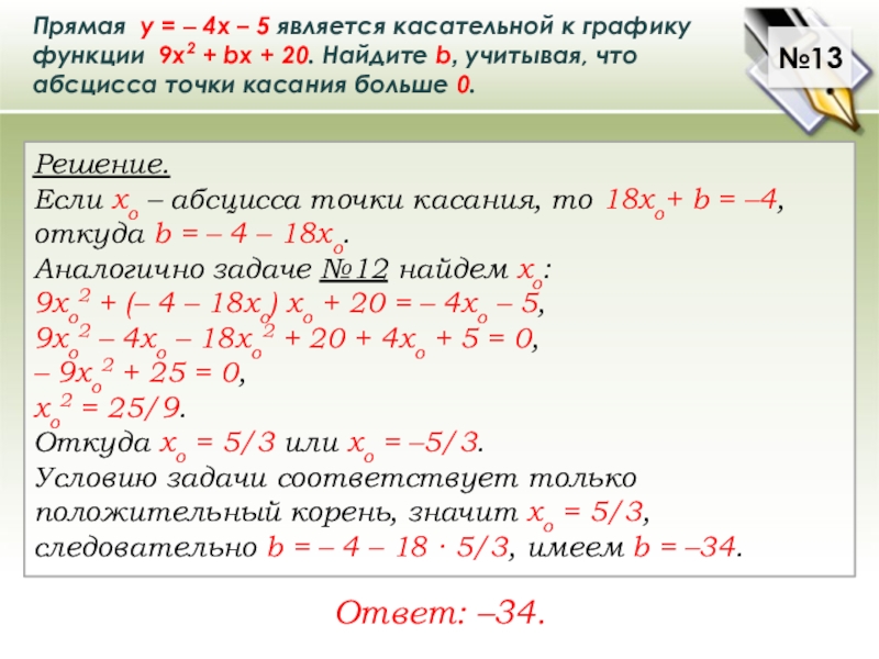 Если хо – абсцисса точки касания, то 18xo+ b = –4, откуда b = – 4 – 18хо.