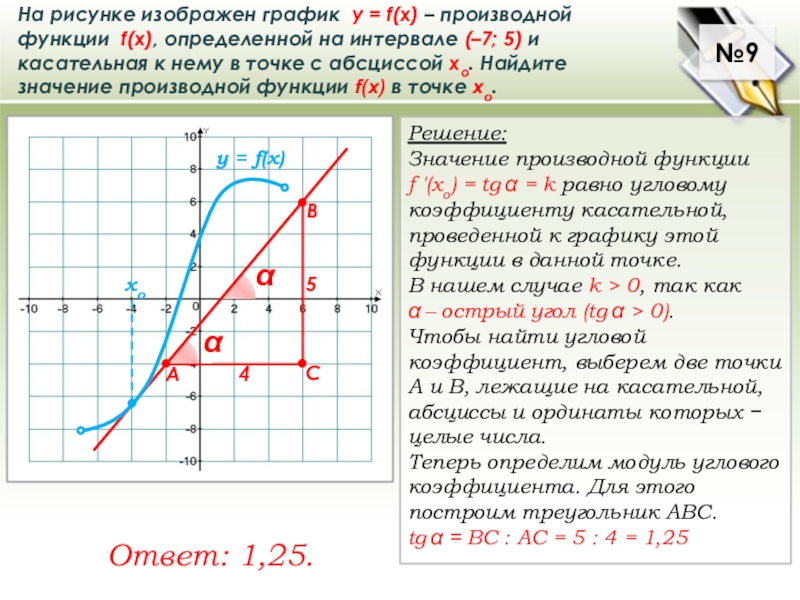 f ′(хo) = tg α = k равно угловому коэффициенту касательной,