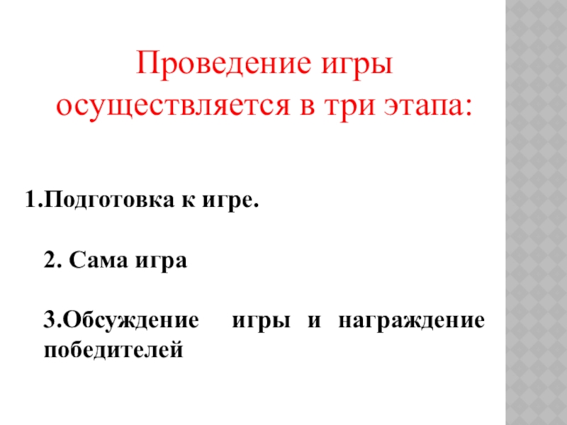 Проведение игры осуществляется в три этапа:Подготовка к игре.2. Сама игра3.Обсуждение игры и награждение победителей