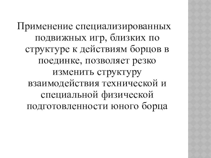 Применение специализированных подвижных игр, близких по структуре к действиям борцов в поединке, позволяет резко изменить структуру взаимодействия