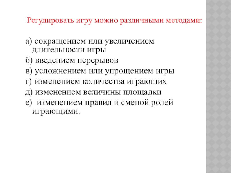 Регулировать игру можно различными методами:а) сокращением или увеличением длительности игрыб) введением перерывовв) усложнением или упрощением игрыг) изменением