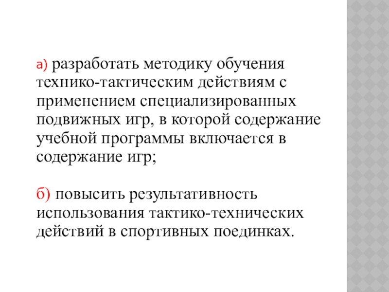 Слайд 10а) разработать методику обучения технико-тактическим действиям с применением специализированных подвижных игр,