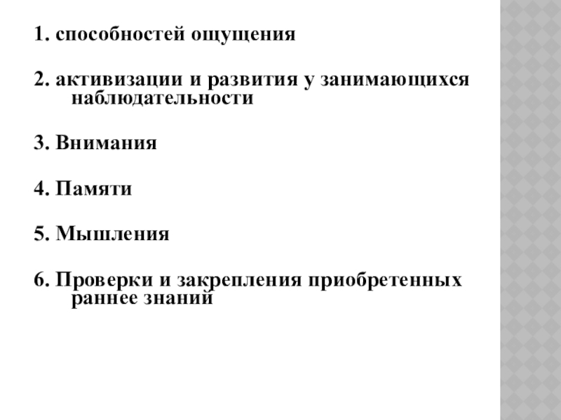 1. способностей ощущения2. активизации и развития у занимающихся наблюдательности 3. Внимания4. Памяти5. Мышления 6. Проверки и закрепления