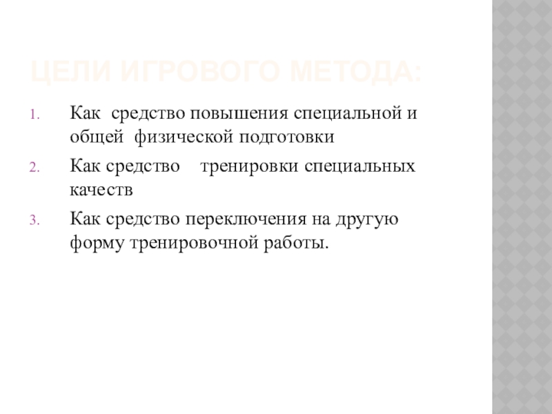 ЦЕЛИ ИГРОВОГО МЕТОДА:Как средство повышения специальной и общей физической подготовкиКак средство тренировки специальных качествКак средство переключения на другую форму тренировочной работы.