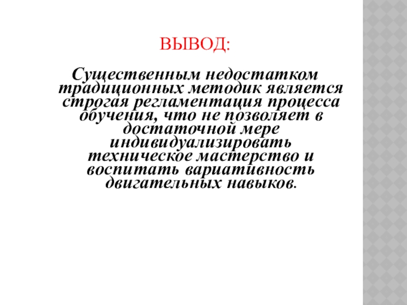ВЫВОД: Существенным недостатком традиционных методик является строгая регламентация процесса обучения, что не позволяет в достаточной мере индивидуализировать