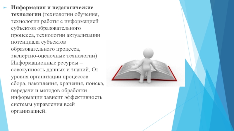 образовательного процесса, технологии актуализации потенциала субъектов образовательного процесса, экспертно-оценочные технологии) Информационные ресурсы – совокупность данных и знаний. От уровня организации процессов сбора, накопления, хранения, поиска, передачи и методов обработки информации зависит эффективность системы управления всей организацией.