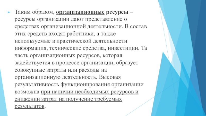 Слайд 8Таким образом, организационные ресурсы – ресурсы организации дают представление о средствах